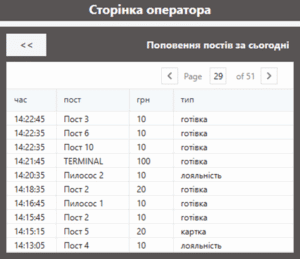 На сторінці оператора відображаються усі операції за сьогодні за різними формами оплати. Це може знадобитися при оперативному контролі мийки, наприклад коли необхідно визначити які проплати пройшли по постам чи аксесурам, терміналу, за QR-посиланнями а також актуальні події. Проплати та події показані у вигляді таблиць з записами, верхні з яких за замовченням є найсвіжішими. Дані автоматично оновлюються з періодичністю 10 секунд, старіші дані за замовченням доступні нижче або на інших закладках таблиці (Page).