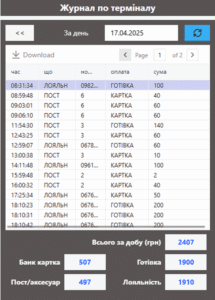 Сторінка Журнал по терміналу відображає усі транзакції по терміналу за вибраний день. На цю сторінку можна перейти зі сторінки фінансовий контроль, натиснувши кнопку Термінал. Сторінка містить таблицю з записами, та сумарні значення.