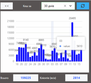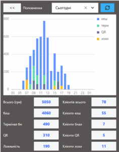 При відображенні за сьогодні або вибрану добу, відображається сумарне поповнення по годинам. Значення під графіком показує години доби, за яку рахується сумарне поповнення. Наприклад на рис.1 в період з 19.00 до 20.00 сумарно було поповнення на 1240 грн. Натиснувши на конкретну колонку також можна подивитися значення за цей час.