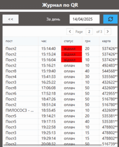 Сторінка Журнал по QR містить інформацію про стан проплат з системи Portmone за вказану дату. Доступ до журналу можна отримати в кабінеті, навіть якщо система керування мийкою відімкнена чи не підключена до мережі Інтернет.